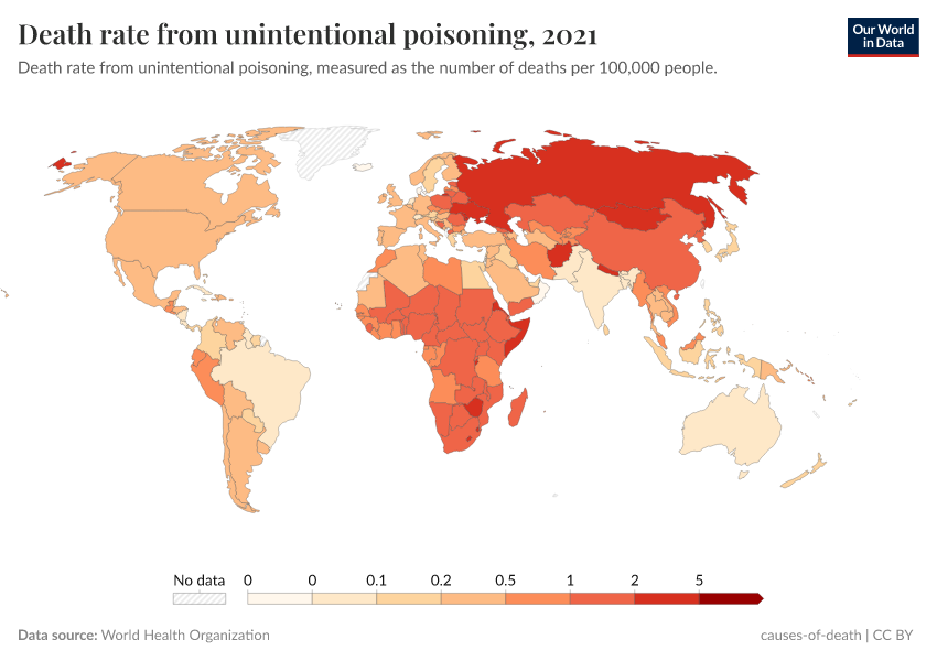 This measures the annual number of deaths per 100,000 people that are attributed to unintentional poisonings.