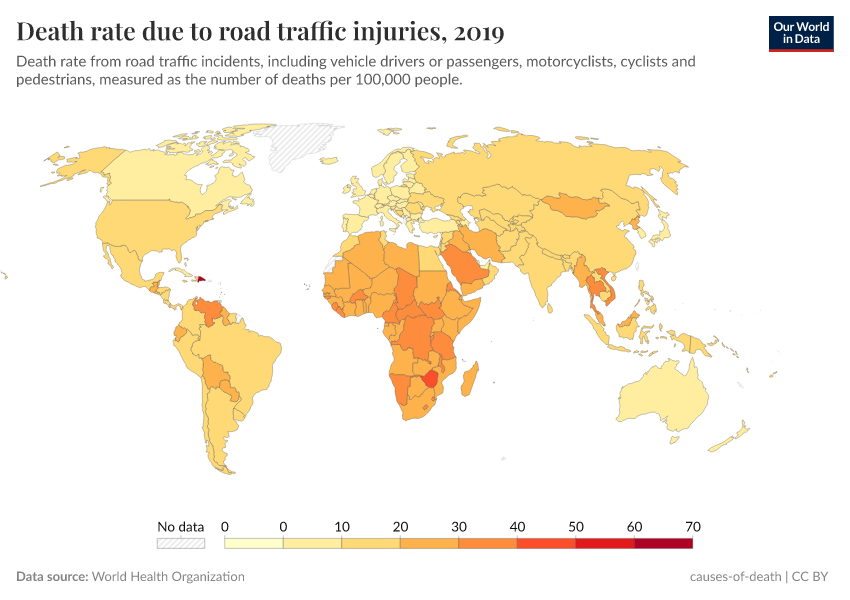 Data for this indicator is shown in the first chart in the series of interactive visualizations. The second chart shows the absolute number of road traffic deaths for additional context.