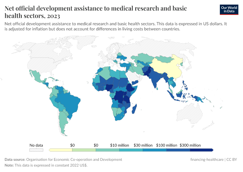 This indicator is measured as disbursements of official development assistance (ODA) and other official flows to the medical research and basic health sectors.