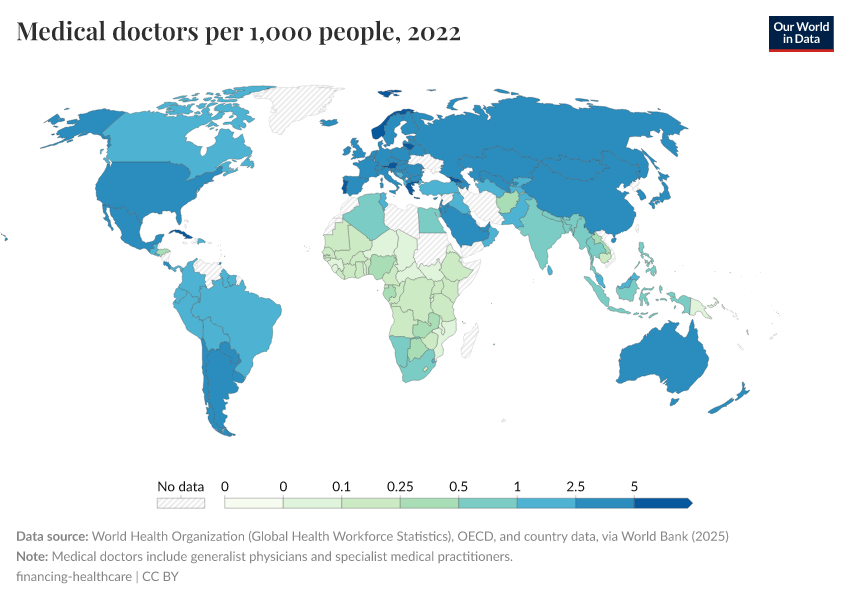 Health worker density is the size of the health workforce per 1,000 people. It is measured here based on the density of physicians, surgeons, nurses and midwives, dentistry and pharmaceutical personnel.