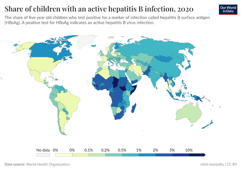 Hepatitis B incidence is the number of new cases of hepatitis B in one year per 100,000 people in a given population. This is measured indirectly as the share of children under 5 years of age with an active Hepatitis B infection, as measured by an Hepatitis B surface antigen test.