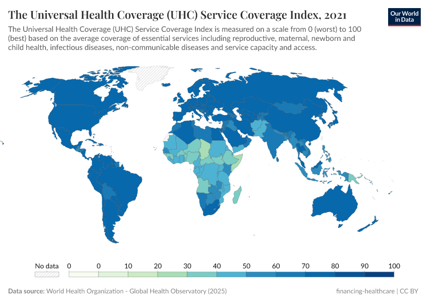 The Universal Health Coverage (UHC) Service Coverage Index is used to track progress on this indicator. The index is on a scale from 0 to 100, where 100 is the optimal value, and calculated from the geometric mean of 14 indicators measuring the coverage of essential services including reproductive, maternal, newborn and child health, infectious diseases, non-communicable diseases and service capacity and access.
