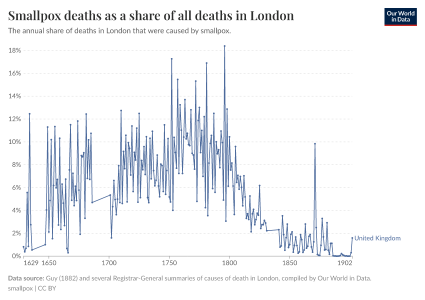 The dramatic decline in smallpox fatalities in response to Jenner's vaccine can be traced in the chart, which shows the number of deaths due to smallpox as a share of all deaths in London from 1629 to 1902. Before the introduction of a smallpox vaccine in 1796, around 7% of all deaths annually were caused by smallpox. Following the introduction of the vaccine, a clear decline in smallpox deaths is visible.