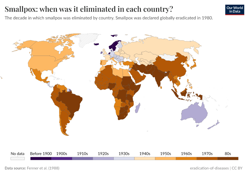 The world map shows the year in which each country recorded the last endemic case of smallpox. As you can see, Europe, North America and Australia managed to eliminate smallpox relatively early, most by the 1940s. This predated the WHO's Intensified Smallpox Eradication Program, which was launched in 1966.