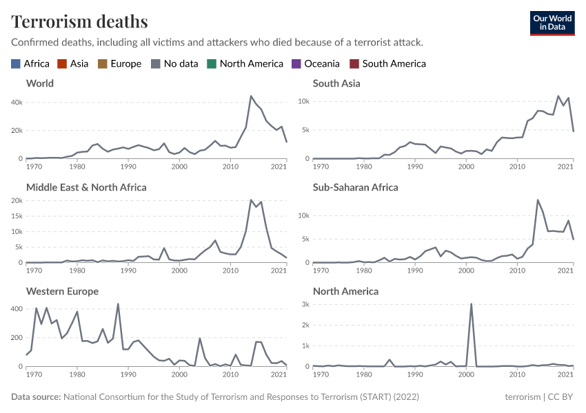 Bastian Herre, Veronika Samborska, Hannah Ritchie, and Max Roser (2023) - “Terrorism” Published online at OurWorldinData.org. Retrieved from: 'https://enhance-improve-who-empower.owid.pages.dev/terrorism' [Online Resource]BibTeX citation