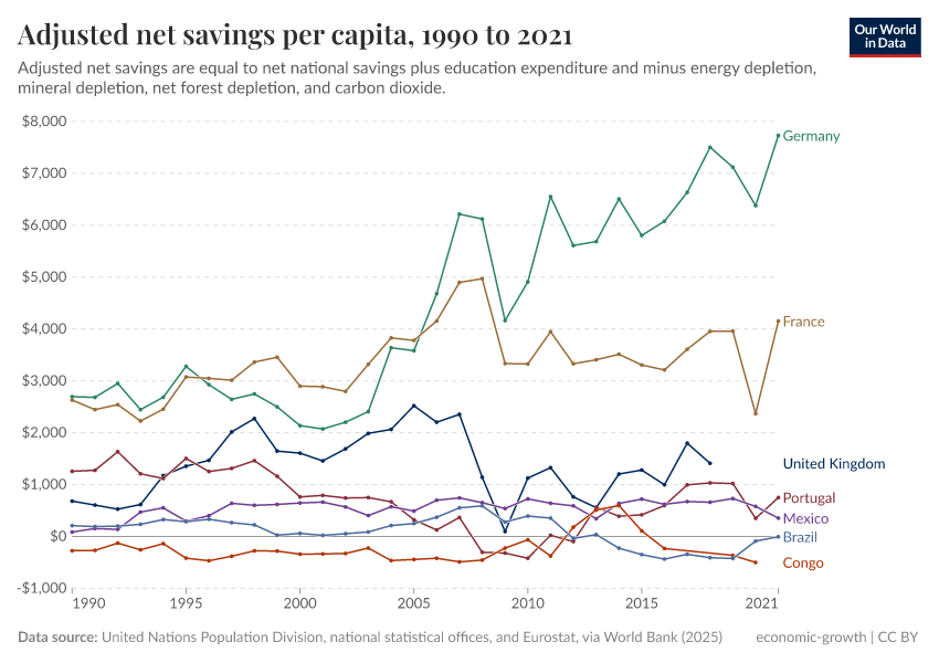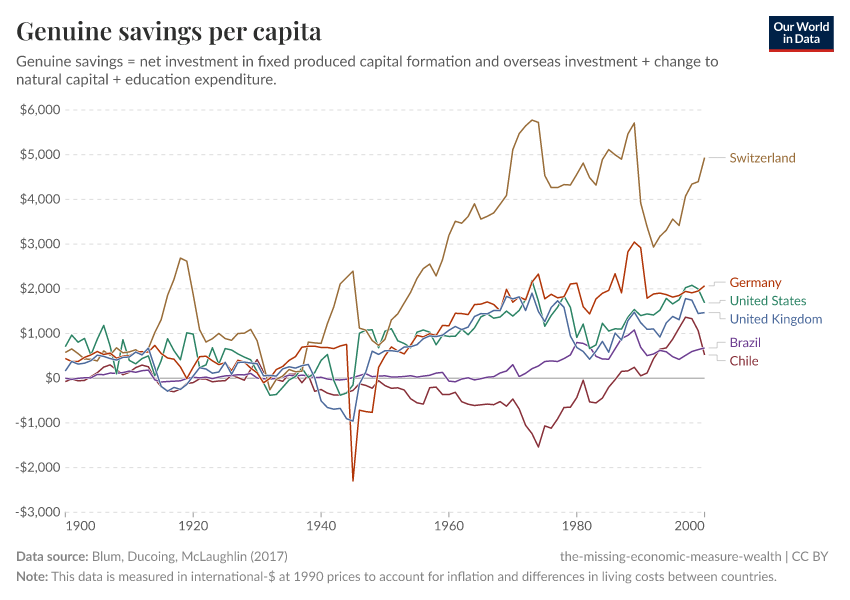 In the chart here, we see genuine saving plotted alongside GDP for the years 1900–2000 for the UK. You can see the data for different countries by clicking "Change country" within the chart.