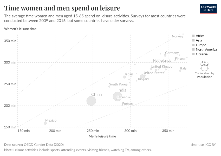 As we can see, in all countries the average leisure time for men is higher than for women — all bubbles are below the diagonal line — but in some countries, the gaps are much larger. In Norway, the difference is very small, while in Portugal men report much more leisure time than women.