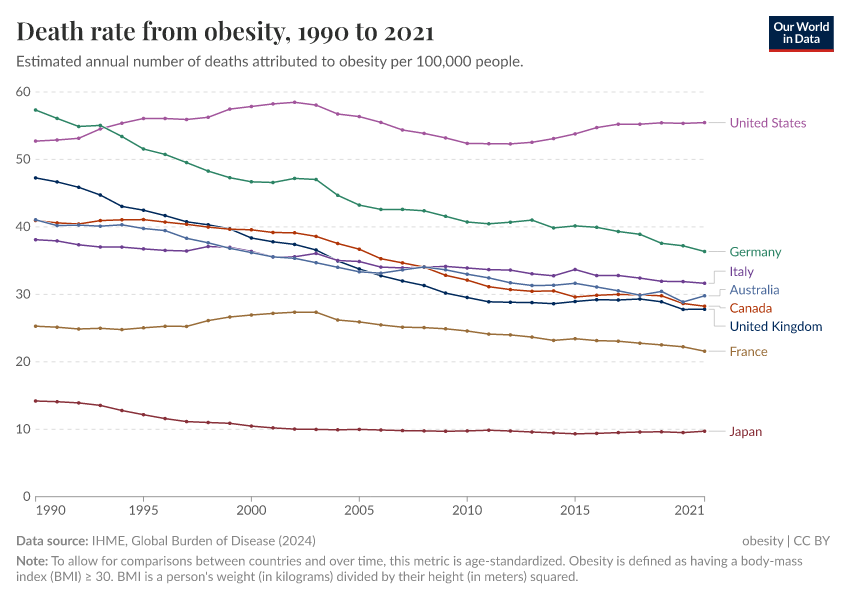 Obesity is a key risk factor for many of the leading causes of death in rich countries, including heart disease, diabetes, some cancers, and stroke.3 Estimates of the death rate from obesity-related factors in the US are higher than for other countries as the chart shows. To improve population health it will be key for all countries to make progress against obesity, for the US it is especially important.