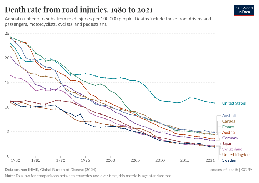 The chart shows that in many countries road deaths are at least 50% less common.