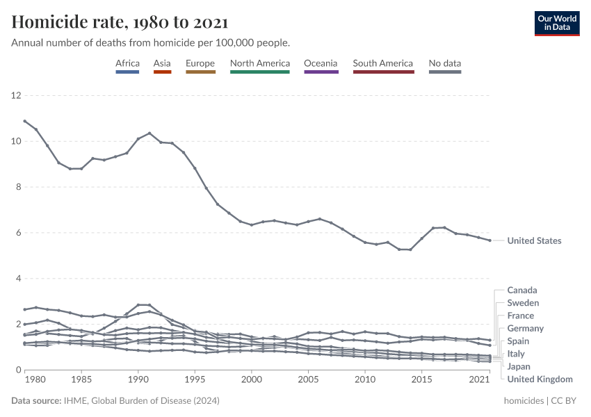 This chart compares homicide rates in the US with a number of other rich countries. No matter which other rich country you add to the chart, you won’t find one with a higher homicide rate. The homicide rate in the US is much higher than in other rich countries.