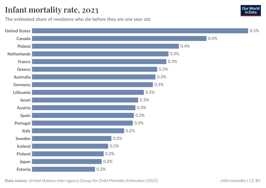 Not just the mortality of infants is higher in the US, but maternal mortality is also much higher. And while maternal mortality is falling in almost all countries in the world the death of mothers is becoming more common in the US.