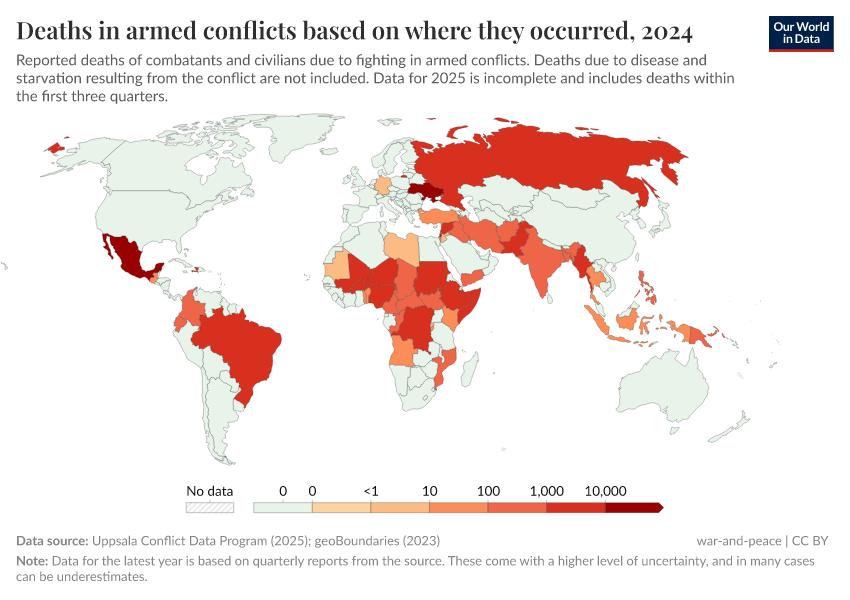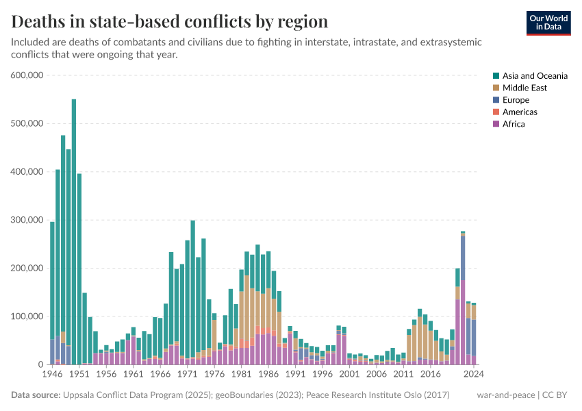 Bastian Herre, Lucas Rodés-Guirao, and Max Roser (2024) - “War and Peace” Published online at OurWorldinData.org. Retrieved from: 'https://enhance-improve-who-empower.owid.pages.dev/war-and-peace' [Online Resource]BibTeX citation