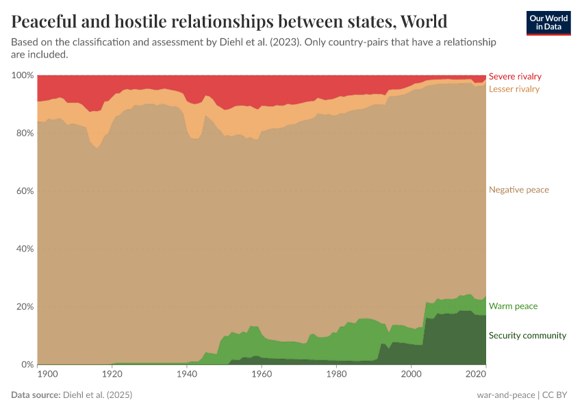 On this page, you can find data, visualizations, and writing on how common war and peace are between and within countries, and how this has changed over time.