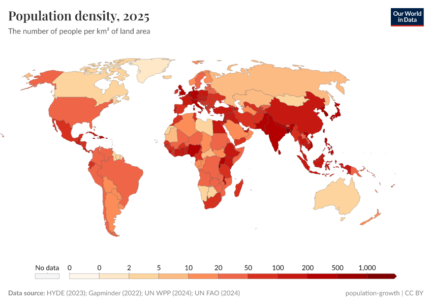 Another way to show where the world population lives is to show the population density of each country on a geographical world map, as you see below. The world's densely populated countries in Middle America, Europe, and South East Asia stand out – Bangladesh is the most densely-populated large country in the world, with 1,252 people per square kilometer. If you hover the mouse on the bracket from 0 to 10 on the legend then you see the world's least densely populated countries.