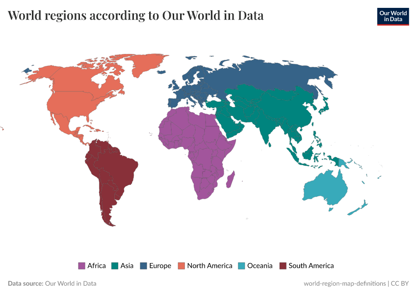 - Our team defines six world regions: Africa, Asia, Europe, North America, Oceania, and South America.