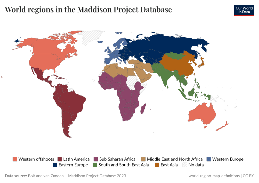 - The Maddison Project Database defines eight world regions: East Asia, Eastern Europe, Latin America, Middle East and North Africa, South and South East Asia, Sub-Saharan Africa, Western Europe, and Western offshoots.