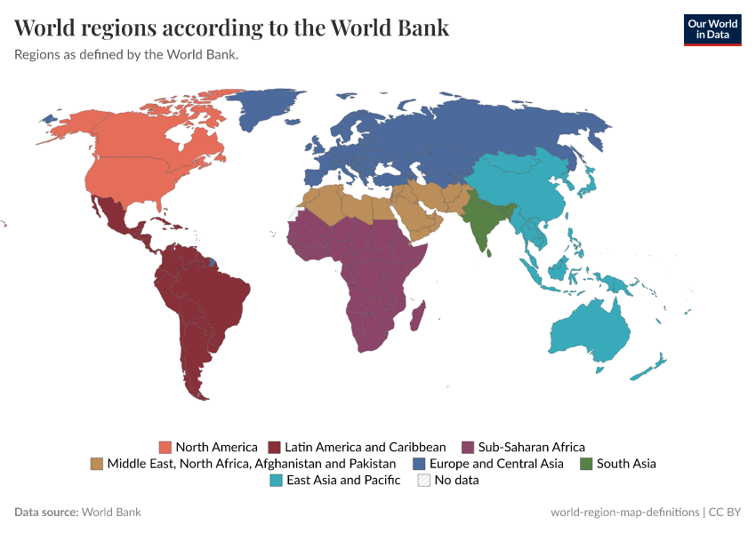 - The World Bank defines seven world regions: East Asia and Pacific, Europe and Central Asia, Latin America and Caribbean, Middle East and North Africa, North America, South Asia, and Sub-Saharan Africa.
