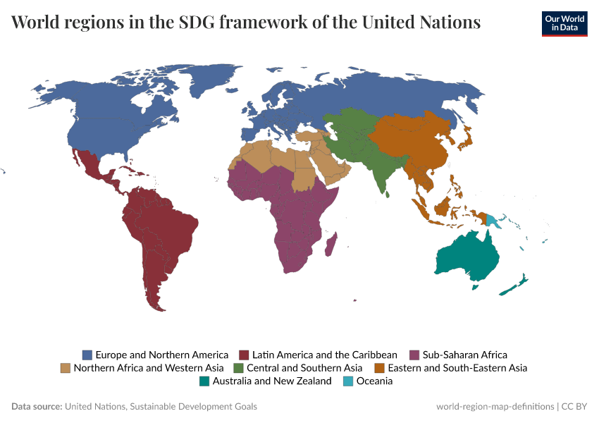 - The United Nations' SDG framework defines eight world regions: Australia and New Zealand, Central and Southern Asia, Eastern and South-Eastern Asia, Europe and Northern America, Latin America and the Caribbean, Northern Africa and Western Asia, Oceania, and Sub-Saharan Africa.